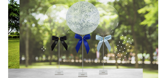 Para quem busca um modelo mais elegante, o Aro Decorativo é uma saída. Onde você poderá prender os balões junto com flores que qualquer noiva ou princesa se encantará. Outra saída é o Buble Tip, onde você coloca um balão maior transparente e arredondado com pequenos balões dentro. Com até 70cm, dará um requinte maravilhoso perto de mesas, portas e janelas.